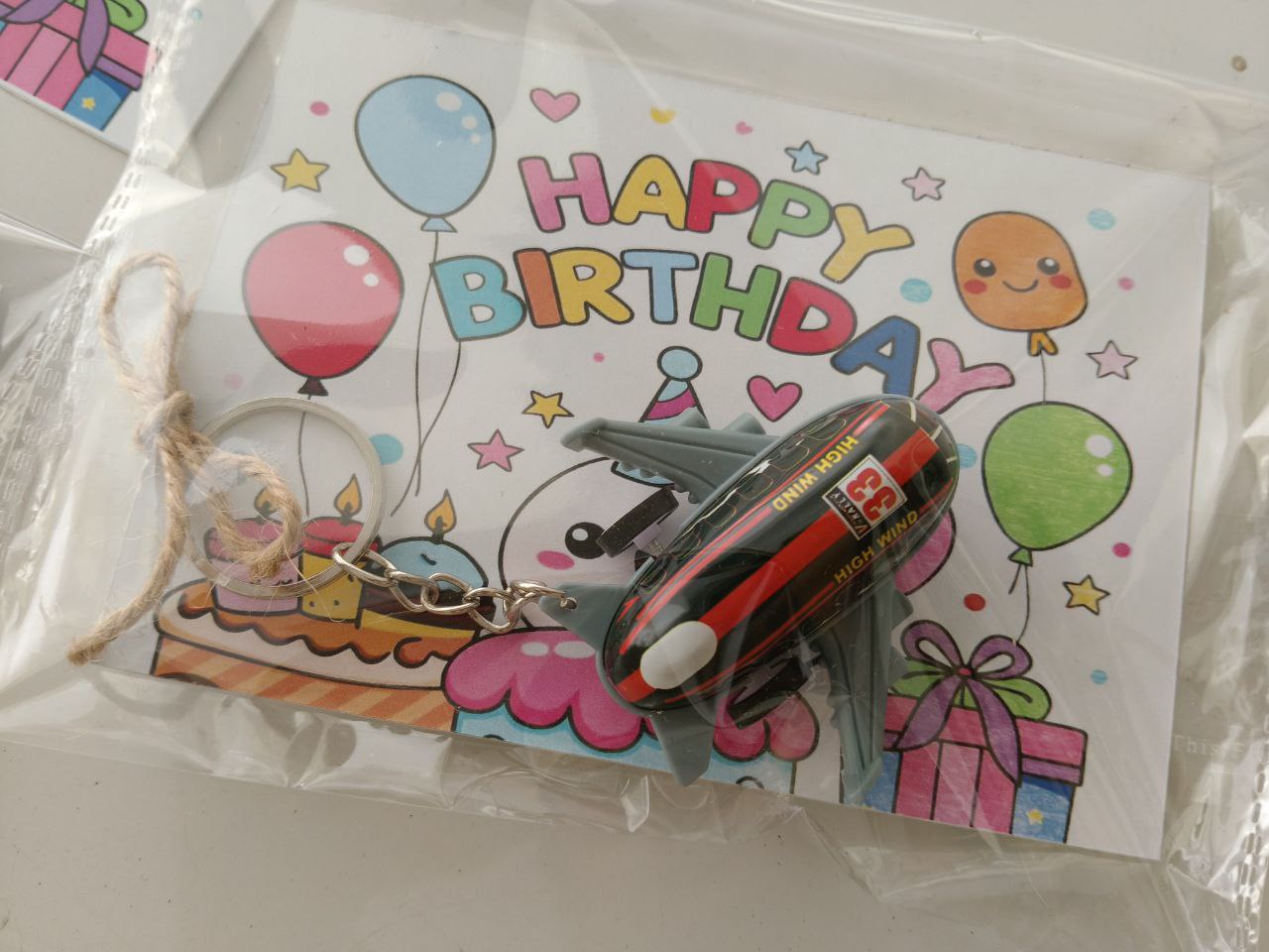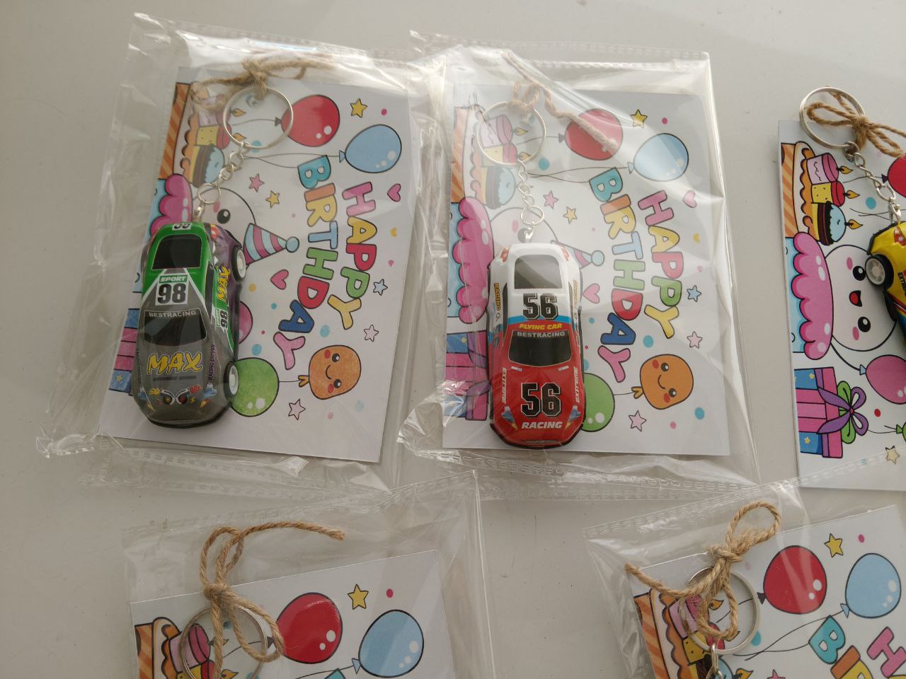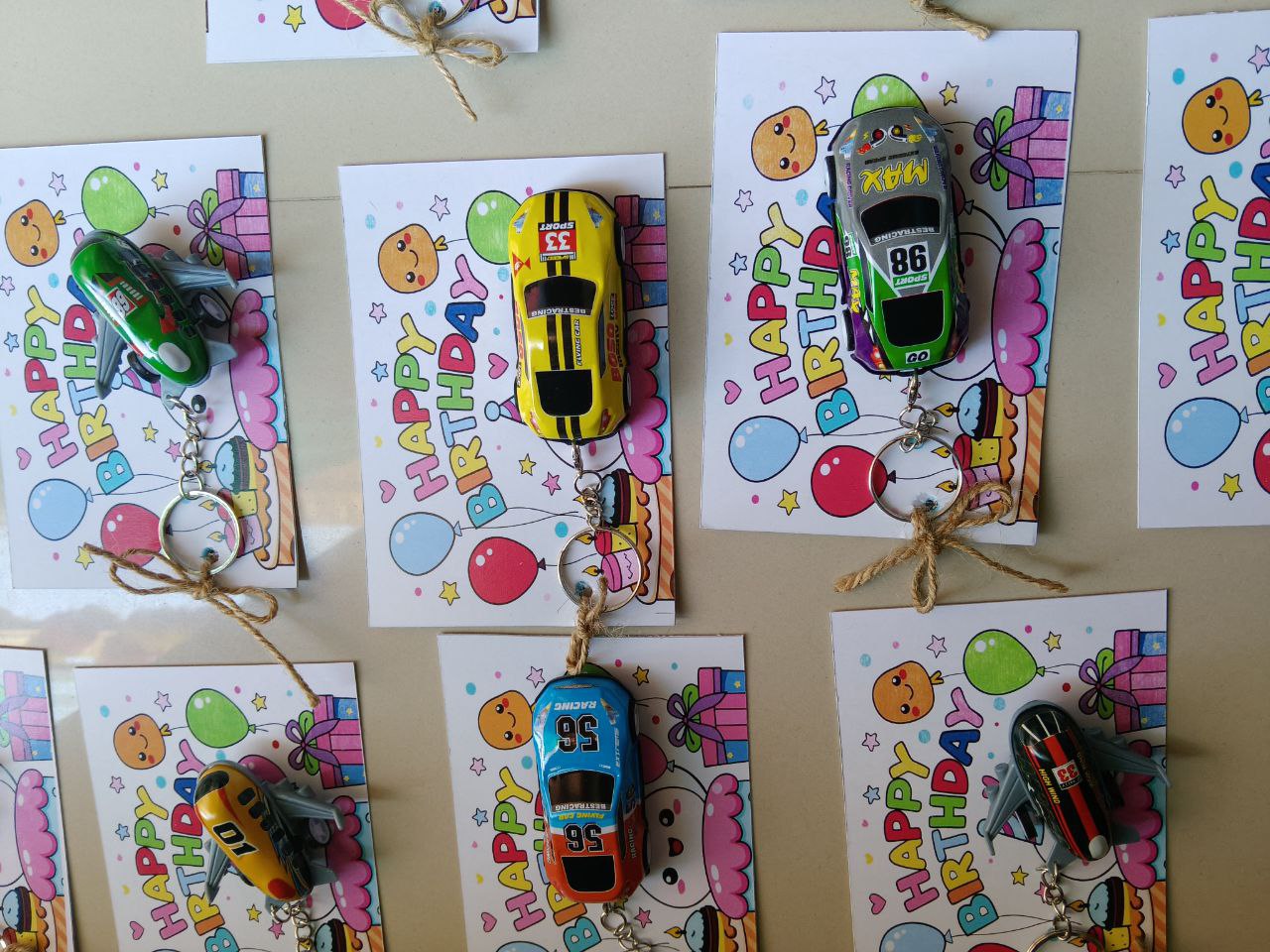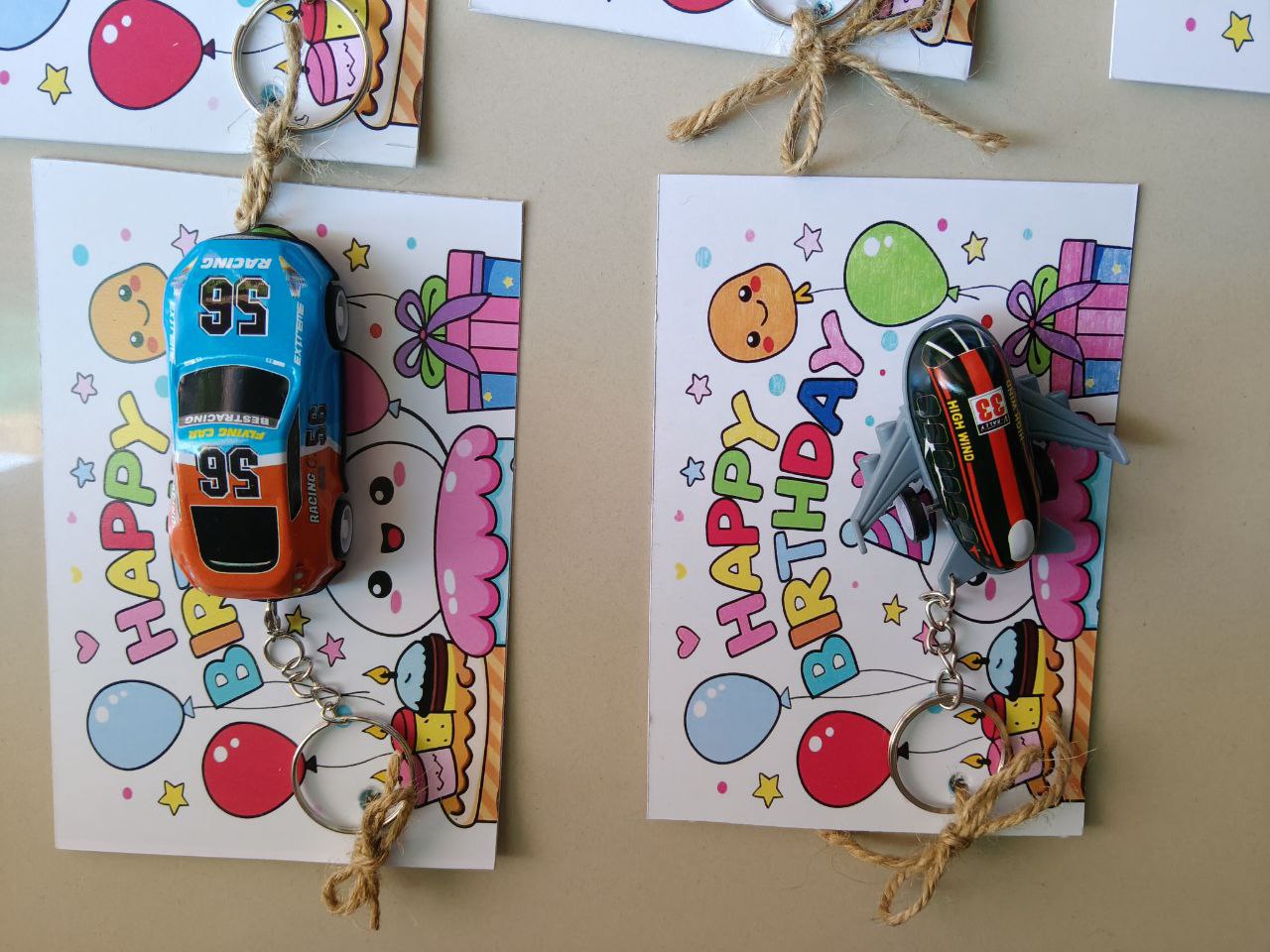 - Attached toy keychains (race cars, airplanes)