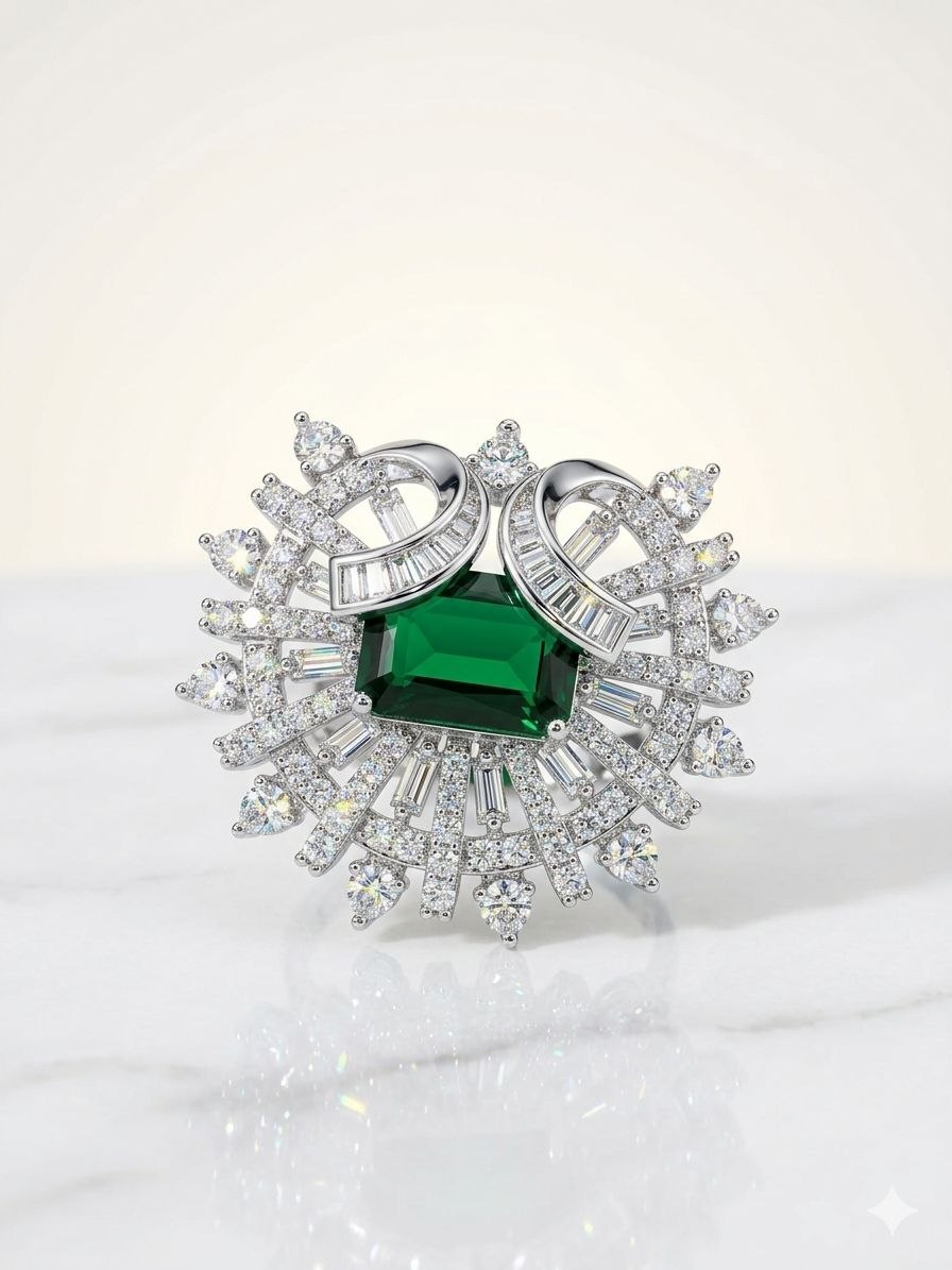 Add a touch of royal elegance to your look with this stunning statement ring. Featuring a rich emerald-green centerpiece surrounded by sparkling high-quality stones, this design reflects luxury and sophistication. The intricate detailing and radiant finish make it perfect for weddings, festive occasions, and special events.