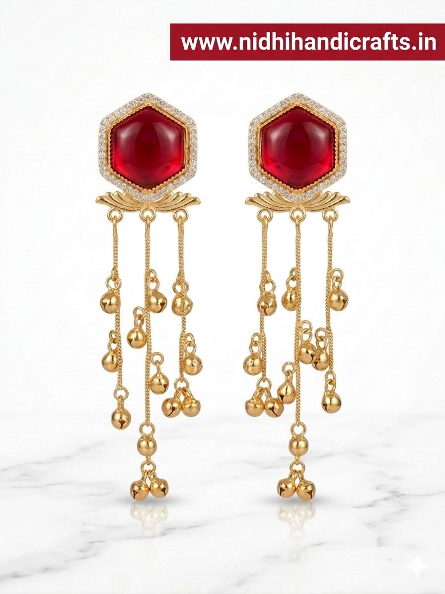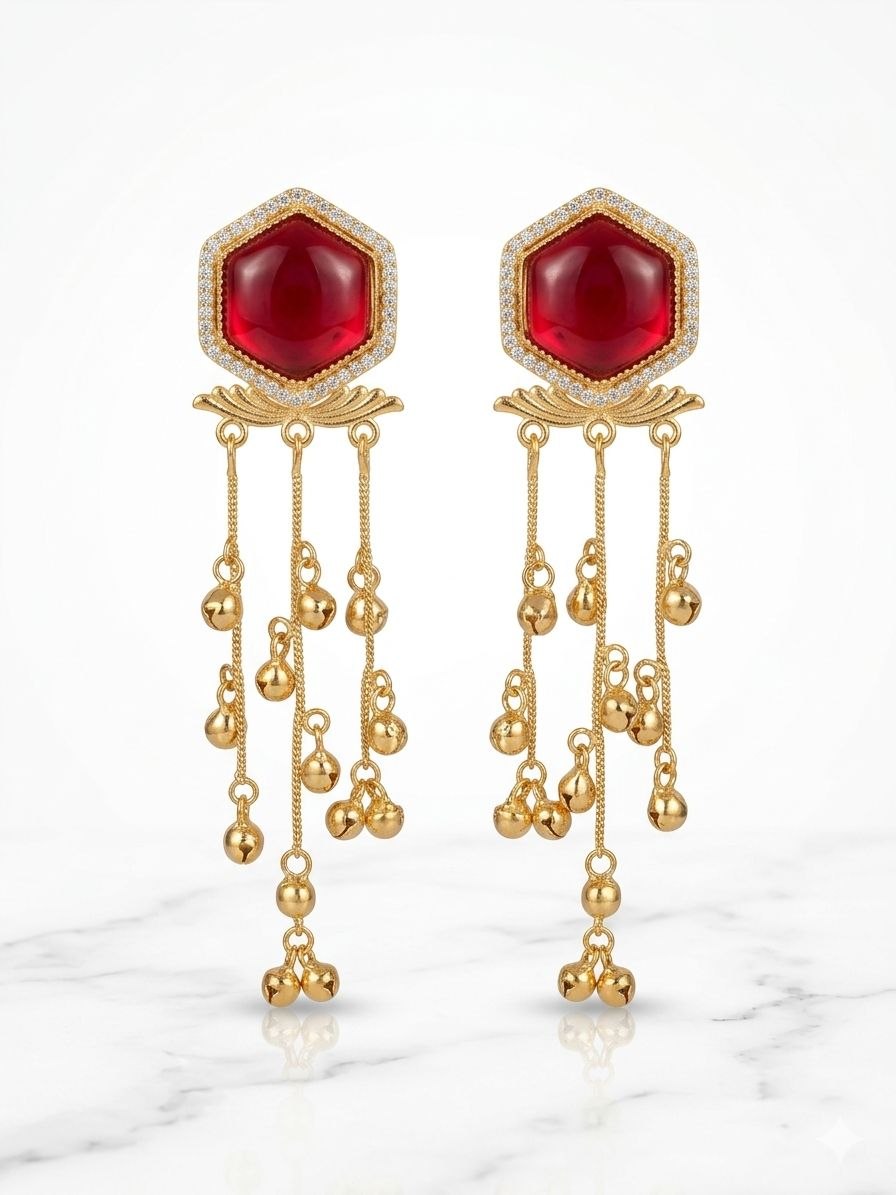 Key Features: Eye-catching red stone top design Elegant long chain danglers with bead detailing Premium gold polish for a royal finish Lightweight & comfortable for long wear Perfect for weddings, festivals & party wear