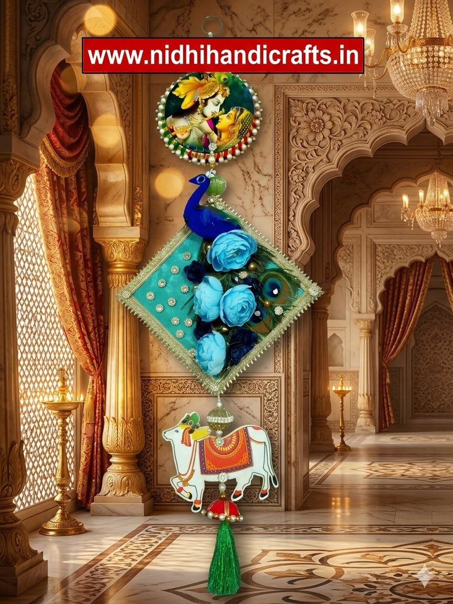 Bring divine charm and traditional elegance to your home with this handcrafted wall hanging featuring Radha Krishna. Designed with vibrant colors, a graceful peacock motif, and intricate floral detailing, this décor piece adds a spiritual and artistic touch to any space. The combination of pearl beads, soft fabric flowers, and traditional cow design at the base makes it perfect for festivals, pooja rooms, or gifting purposes. Its premium finish and unique Rajasthani style enhance the beauty of your walls effortlessly.