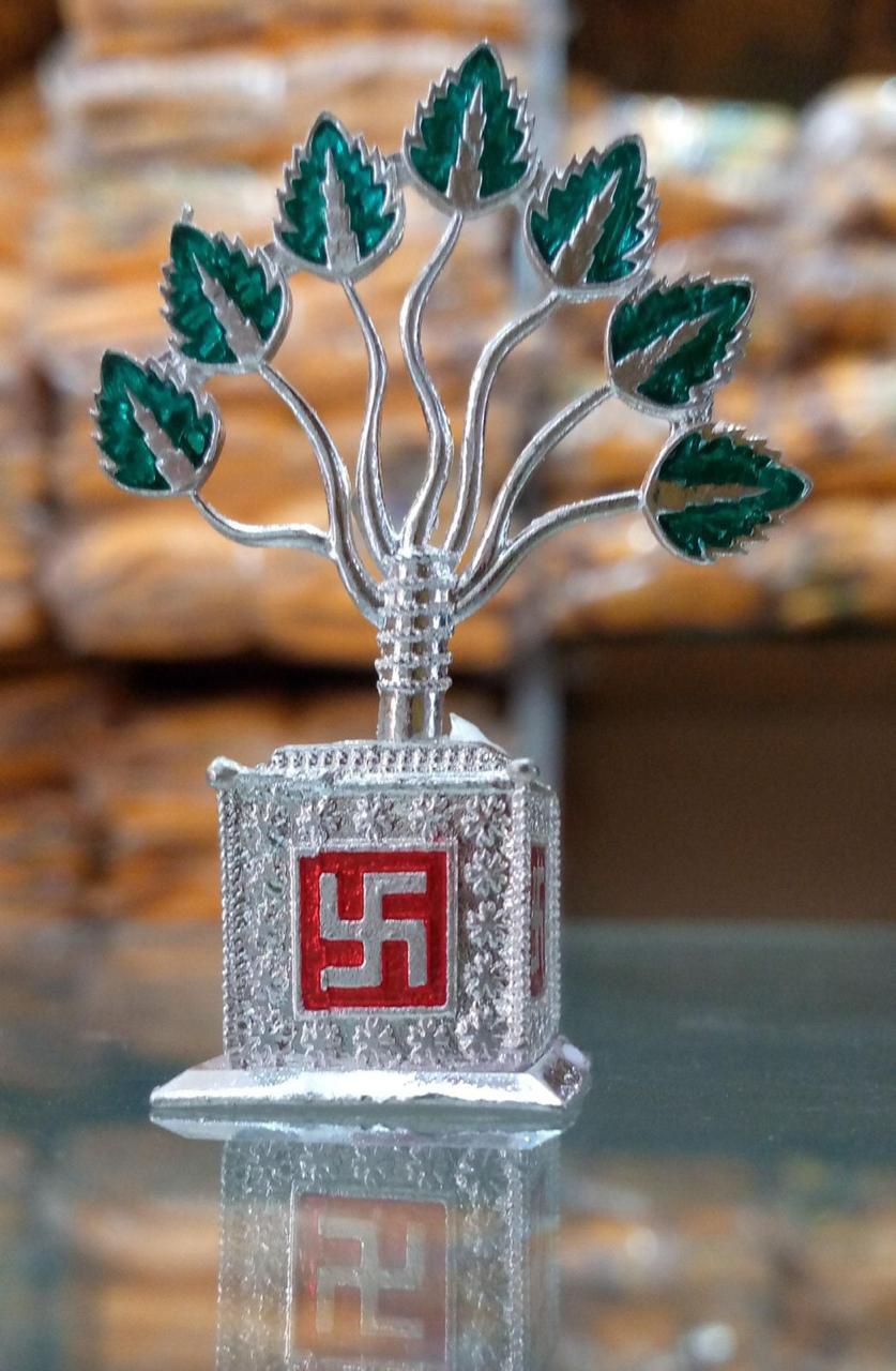 Kalpavriksha tree with enamel leavesBase: Square pedestal with Swastik symbolFinish: Premium glossy look with fine detailing.